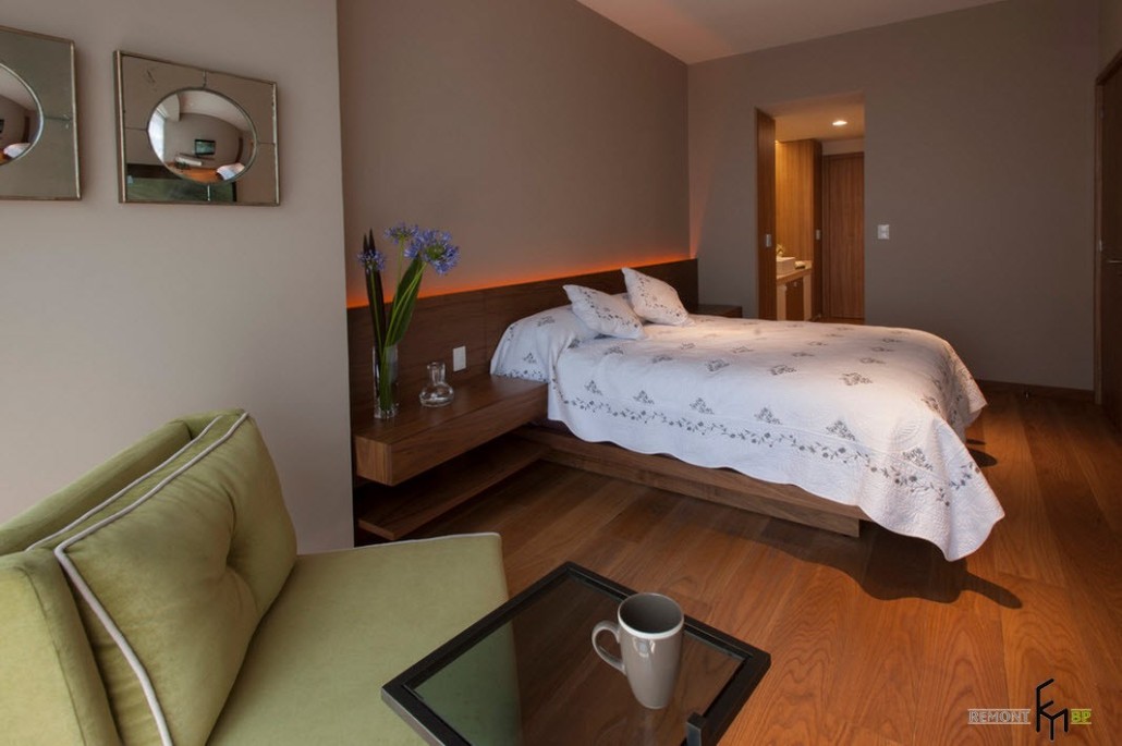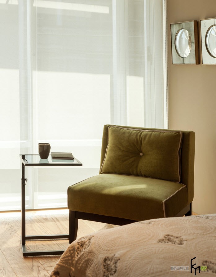 Цветовая гамма тумб у изголовья кровати соответствует общей цветовой идее мексиканской квартиры. В помещении имеется небольшое мягкое креслице без подлокотников с обивкой коричневато-зеленого цвета и компактный металлический столик со стеклянной столешницей.