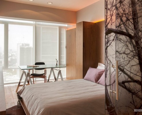В мексиканской квартире имеются две спальные зоны. Спальня и гостиная разделяются при помощи оригинальной светло-бежевой перегородки. Такое устройство позволяет воздуху и солнечному свету проникать в зону спальни. Легкая перегородка одновременно объединяет и разграничивает эти помещения, призванные выполнять различные функции.