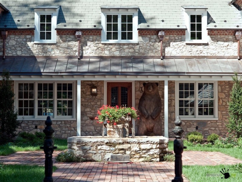 Находясь на улице, перед главным входом в загородный коттедж, у нас уже не возникает никаких сомнений о стилистической принадлежности оформления этого здания. Каменная отделка стен, использование деревянных и кованых элементов – все указывает на сельский образ жизни и вкусовые предпочтения хозяев дома. Уже по экстерьеру здания мы понимаем, что внутри помещений не встретим пластиковой мебели, хромированной мебельной фурнитуры или линолеума в качестве напольного покрытия.