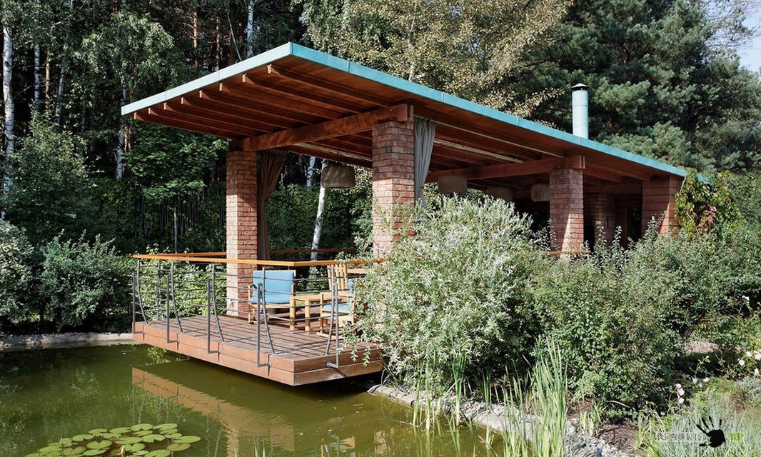 Территория участка велика и ее границы уходят в лесные заросли. Вблизи домовладения расположен довольно масштабный пруд с патио под навесом. Капитальное строение из кирпича и дерева позволяет организовать отдых на свежем воздухе в любую погоду. Различные виды досуга – от приготовления барбекю до принятия воздушных ванн, доступны в этом многофункциональном месте отдыха под навесом.