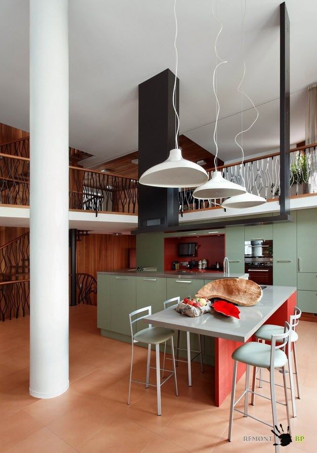 Пристроенная к острову столешница для организации места для коротких трапез – дизайнерская находка, которая придется по душе многим домовладельцам. Часто нет времени и сил, чтобы накрыть большой обеденный стол для завтрака, например – небольшая столовая зона прямо в кухонном пространстве с небольшой столешницей и удобными барными стульями станет комфортным местом для перекуса или недлительной трапезы. Завершает эту интересную композицию система из трех белоснежных подвесных светильников, которые не только обеспечат зону завтраков достаточным уровнем освещенности, но и создадут некоторое условное зонирование просторного помещения.