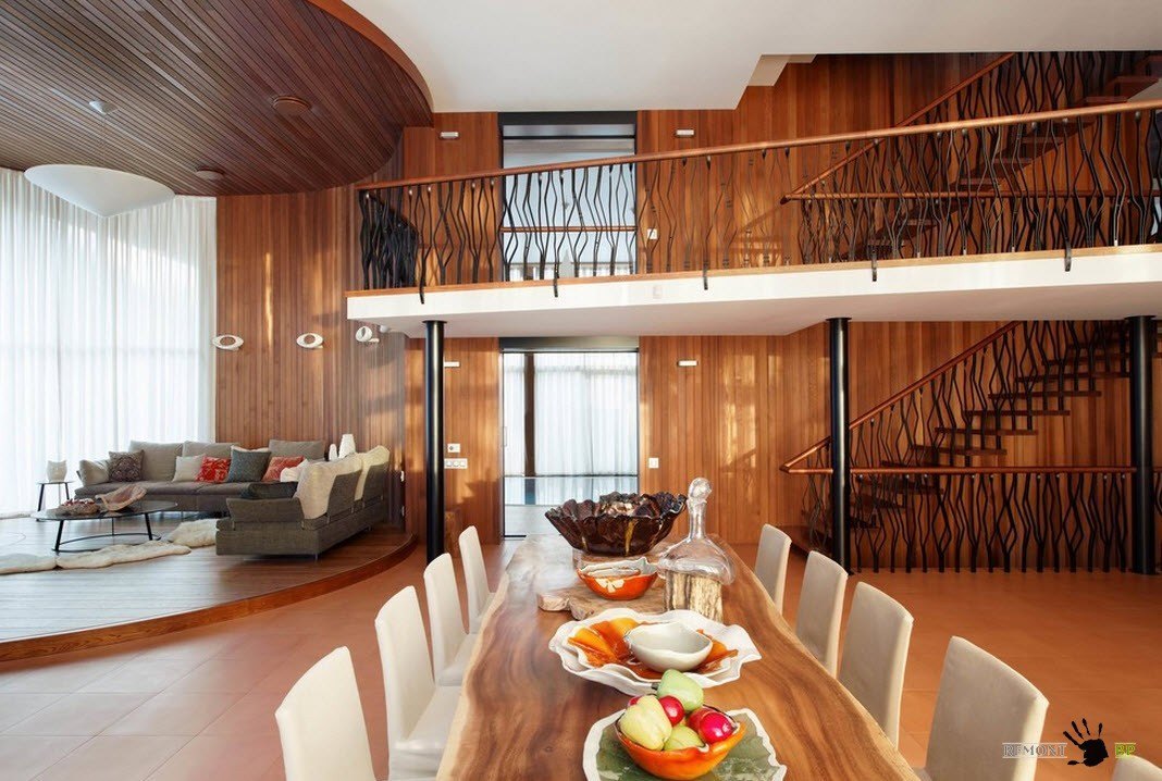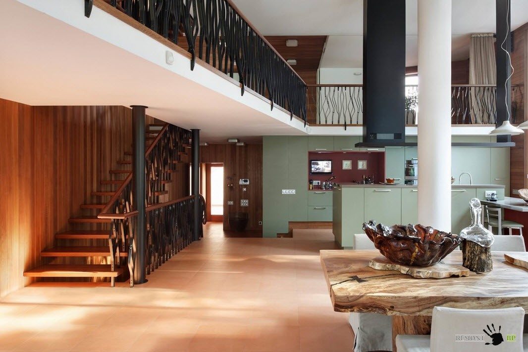 Для того чтобы подняться на второй этаж подмосковного дома, необходимо воспользоваться надежной, удобной, но при этом креативной лестницей, дизайн которой сам по себе является изюминкой домовладения. Сочетание дерева и металла, тепла и прохлады, темного и яркого в дизайне лестницы, позволило создать поистине оригинальную и неповторимую конструкцию. Несмотря на нетривиальный внешний вид, лестница безопасна и удобна даже для пожилых людей и маленьких детей.