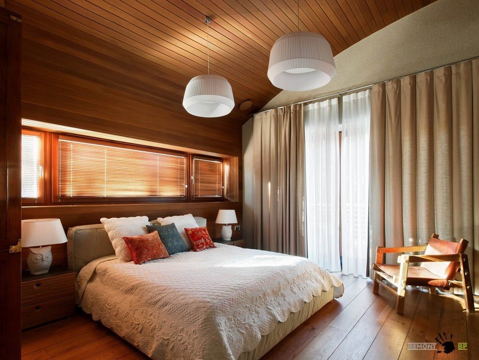 На втором этаже находится спальня с достаточно простым и лаконичным интерьером. Любовь дизайнеров и хозяев домовладения к облицовке поверхностей с помощью деревянных панелей нашла отражение и в дизайне комнаты для сна и отдыха. Теплые, природные оттенки с чередованием светлых поверхностей создают уютную, спокойную и расслабленную атмосферу – благоприятный фон для крепкого сна.