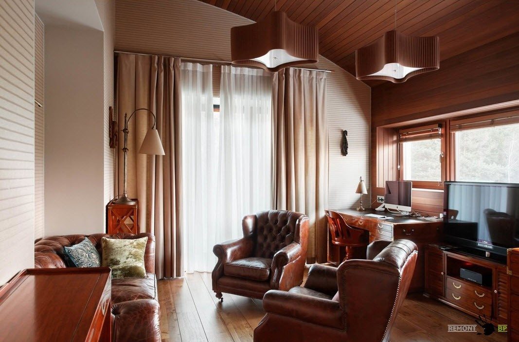 Помимо небольшой рабочей зоны, в загородном домовладении есть кабинет с гостиной зоной. Использование натурального дерева для изготовления мебели и облицовки некоторых поверхностей – классика жанра для помещения кабинета, так же как и кожаная обивка кресел, выполненных в английском стиле. Но эти вполне себе классические элементы интерьера перемежаются с современными предметами обихода, техникой, осветительными приборами урбанистического дизайна.