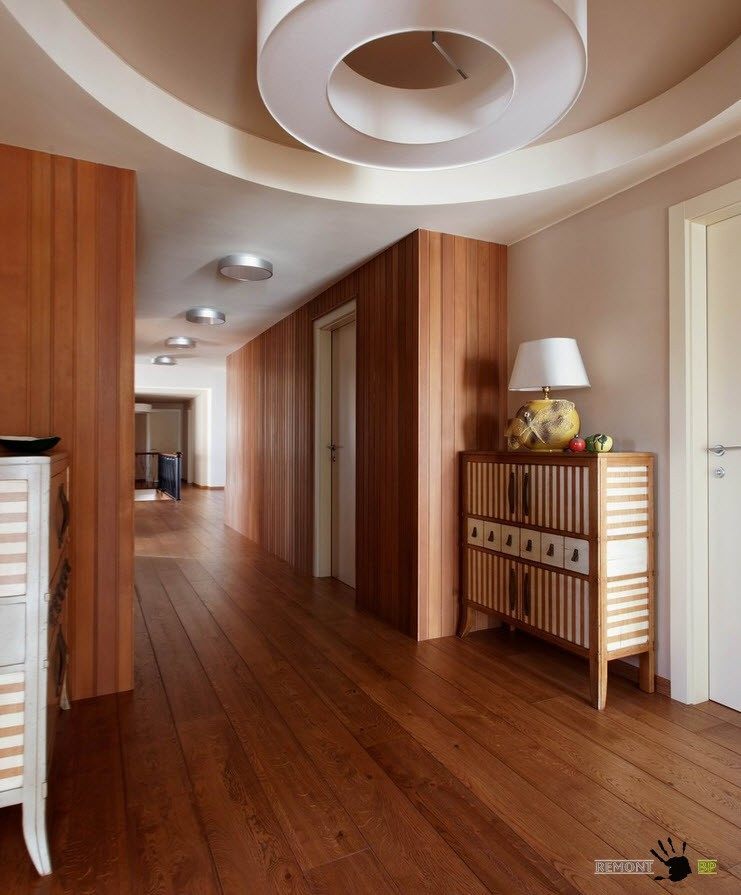 Даже в просторных коридорах второго этажа тематическое использование окружностей не покидает основу дизайна всего подмосковного домовладения. Использование круглых форм в оформлении двухуровневого подвесного потолка, в дизайне люстр и строенных светильников, помогает компенсировать обилие острых углов, прямоугольных и квадратных встроенных систем хранения, оформления дверных проемов и оригинальных моделей комодов, расположенных в дополнительных помещениях коридоров.