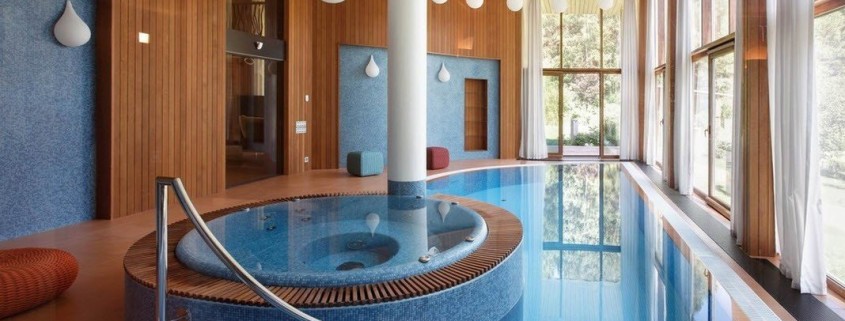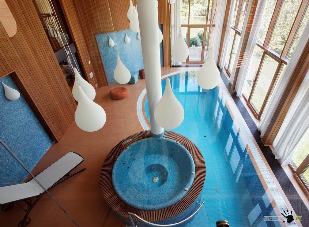Белоснежные светильники, свисающие как капли воды и такого же оттенка тонкий текстиль в оформлении панорамных окон, добавили атмосфере помещения нарядности, приподнятого настроения, легкости и позитива. И даже здесь тема окружности актуальна – джакузи и полукруглые формы некоторой части бассейна.
