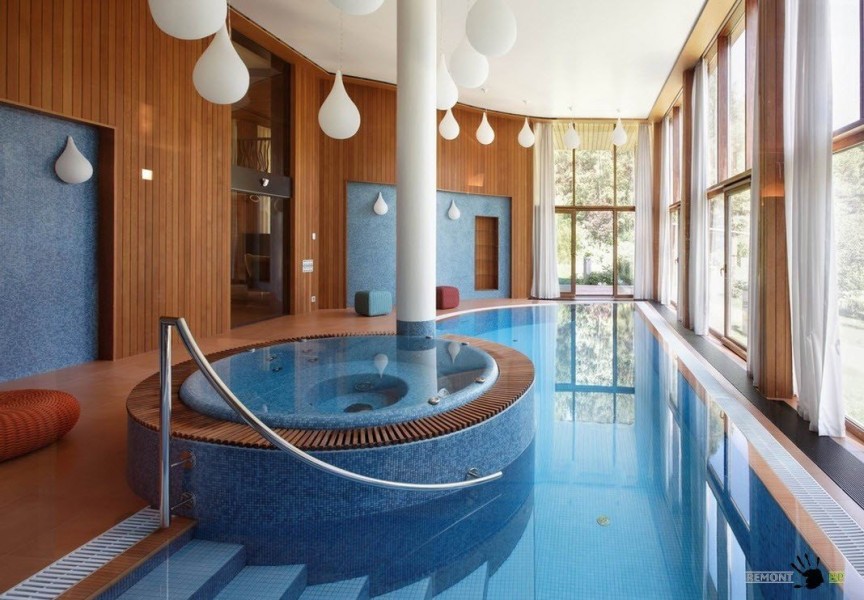 Гордость подмосковного домовладения – помещение с бассейном и джакузи. Просторная застекленная веранда с вместительным искусственным водоемом буквально утопает в солнечном свете. Чередование поверхностей цвета чистого неба и древесной отделки с вкраплениями белоснежных оттенков, создает невероятно праздничную, но при этом умиротворяющую атмосферу. Мозаика с мелкими чипами и деревянные настенные панели создали очень гармоничный союз, несмотря на противоположную «цветовую температуру».