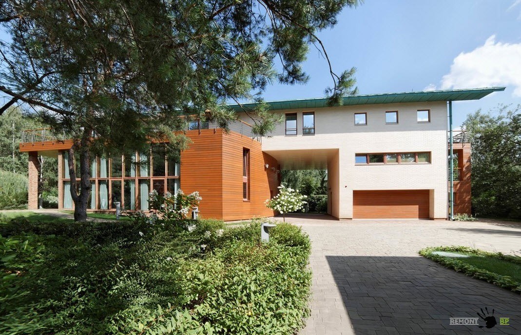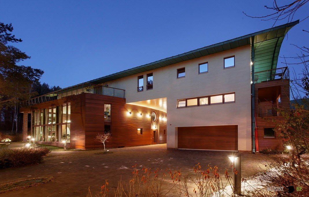 Внешний вид здания поражает с первого взгляда – сочетание различных геометрических фигур, способов отделки, цветов и фактур создает оригинальный образ частного домовладения, современного, эклектичного и внешне очень привлекательного. Сочетание цветов в палитре фасада здания отражает близость к природе – облицовка деревянными панелями сменяется светло-бежевой штукатуркой и переходит к светло-зеленому оформлению крыши. Природные оттенки прекрасно работают на создание оригинального внешнего вида загородного дома.