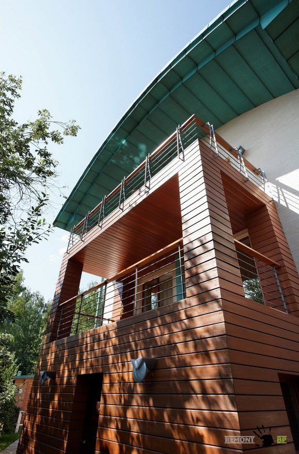 С торца здания видно, что крыша имеет полукруглую форму, аналогичная конструкция повторена в выпуклой части первого этажа. Сочетание больших панорамных окон и ярко-рыжей деревянной облицовки создает интересный альянс, вместе с окрашенной в светло-бежевый тон кирпичной кладкой, фасад смотрится роскошно. Большая открытая терраса на втором этаже предоставляет много пространства для организации мест для отдыха на свежем воздухе. Небольшой козырек выступающей части крыши служит для создания тени в жаркий день и некоторой защиты в случае непогоды.