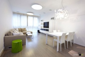Тема окружности стала основой концепции дизайна гостиной зоны – круглый журнальный столик с зеркальной столешницей стал центром мягкого сегмента, с расставленными возле него удобными низкими диванами. Круглый камин, за пламенем которого можно наблюдать с любой точки гостиной зоны, является безусловным фокусным центром. Его темное оформление контрастно смотрится на фоне белоснежных штор эркера. Помимо прочего, тематика окружности нашла свое применение и в системе освещения – для такого просторного помещения с высокими потолками вопрос достаточного уровня освещенности стоит весьма остро. Каждая функциональная зона нуждается в своей системе светильников того или иного типа. В гостином сегменте таким центральным элементом освещения стала большая белоснежная люстра с матовой поверхностью плафона.