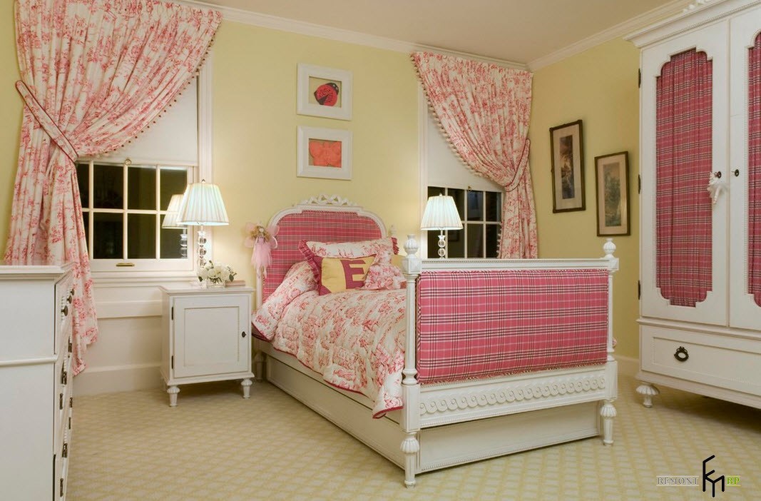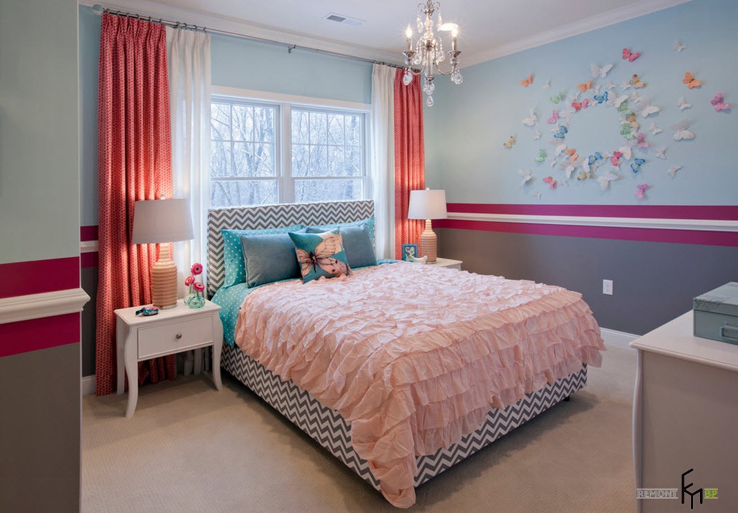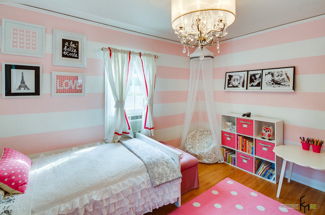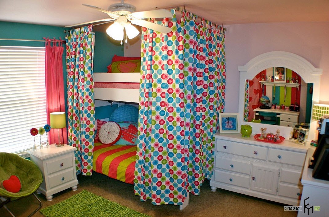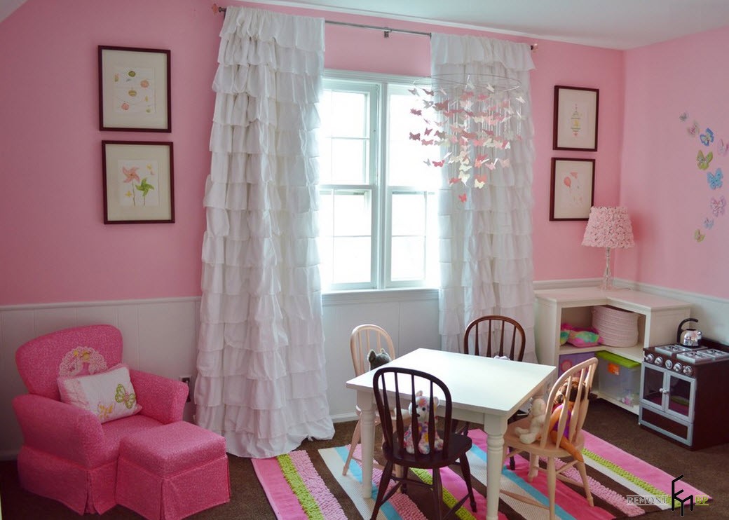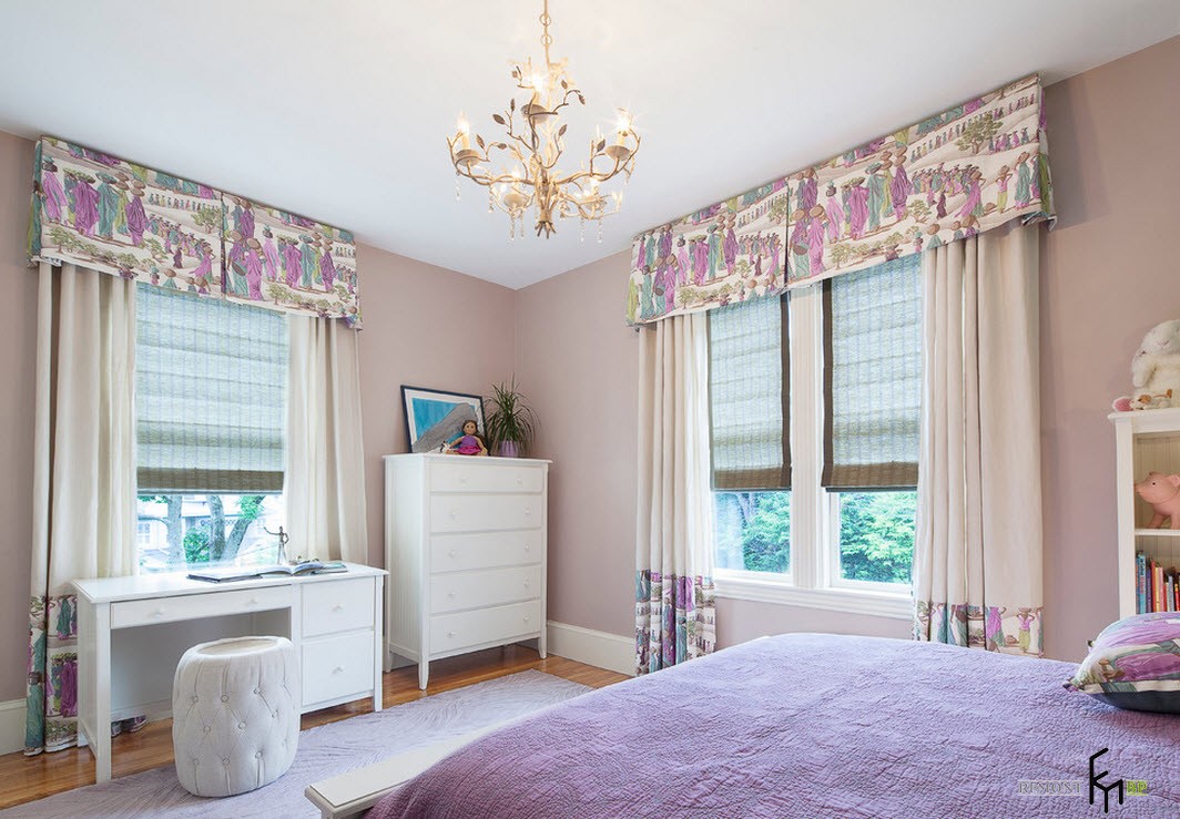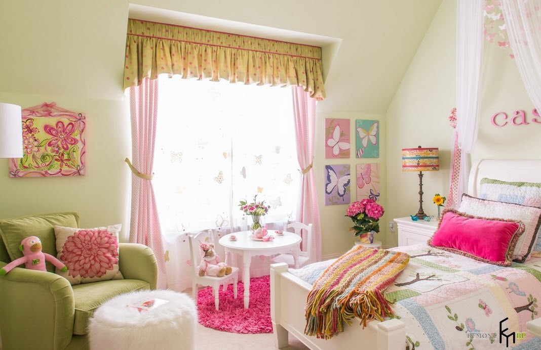 Версии с бантиками, завязанные с привлечением лент разных цветов и отличающихся по ширине, в одночасье придадут комнате парадный вид. Рюши, края полотен, с отделкой из металлизированной тесьмы или ажурных шнуров, пристегивающиеся клипсы – бабочки, ангелы и подобная атрибутика в принципе отвечают девчачьей природе. В целом гамма представлена радужными цветами, но модной считается смелое сочетание, как фисташковый с розово-красными тонами.