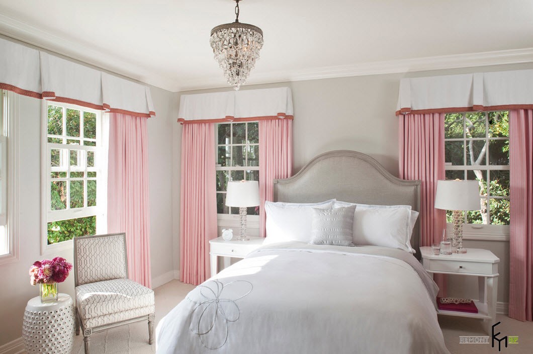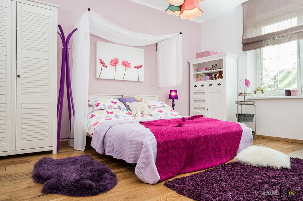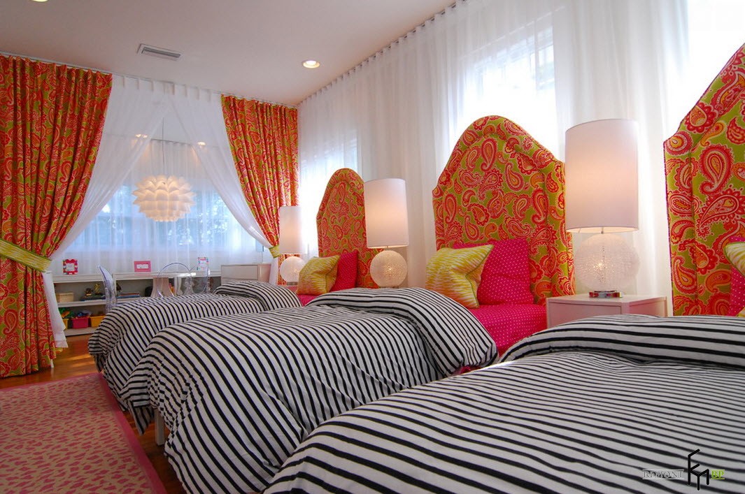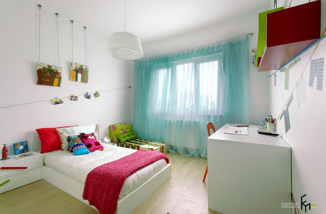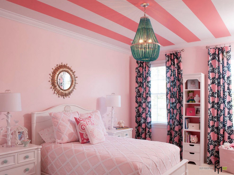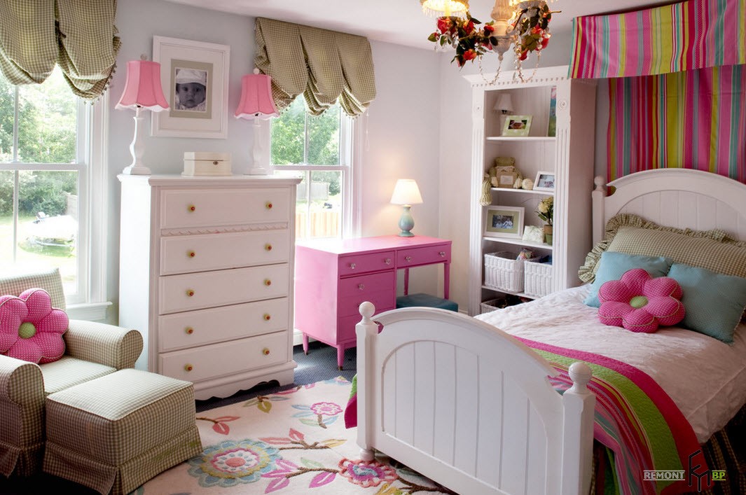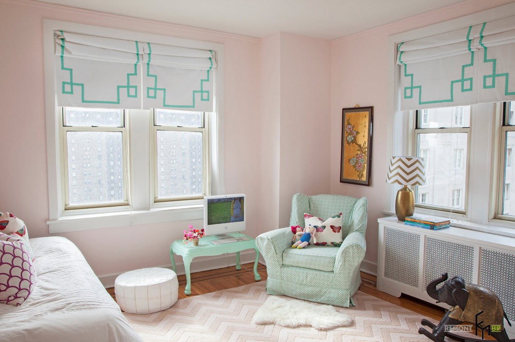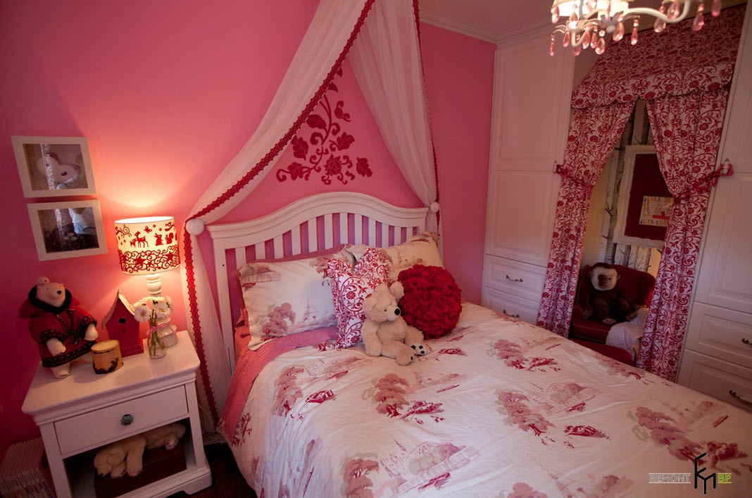 Версии с бантиками, завязанные с привлечением лент разных цветов и отличающихся по ширине, в одночасье придадут комнате парадный вид. Рюши, края полотен, с отделкой из металлизированной тесьмы или ажурных шнуров, пристегивающиеся клипсы – бабочки, ангелы и подобная атрибутика в принципе отвечают девчачьей природе. В целом гамма представлена радужными цветами, но модной считается смелое сочетание, как фисташковый с розово-красными тонами.