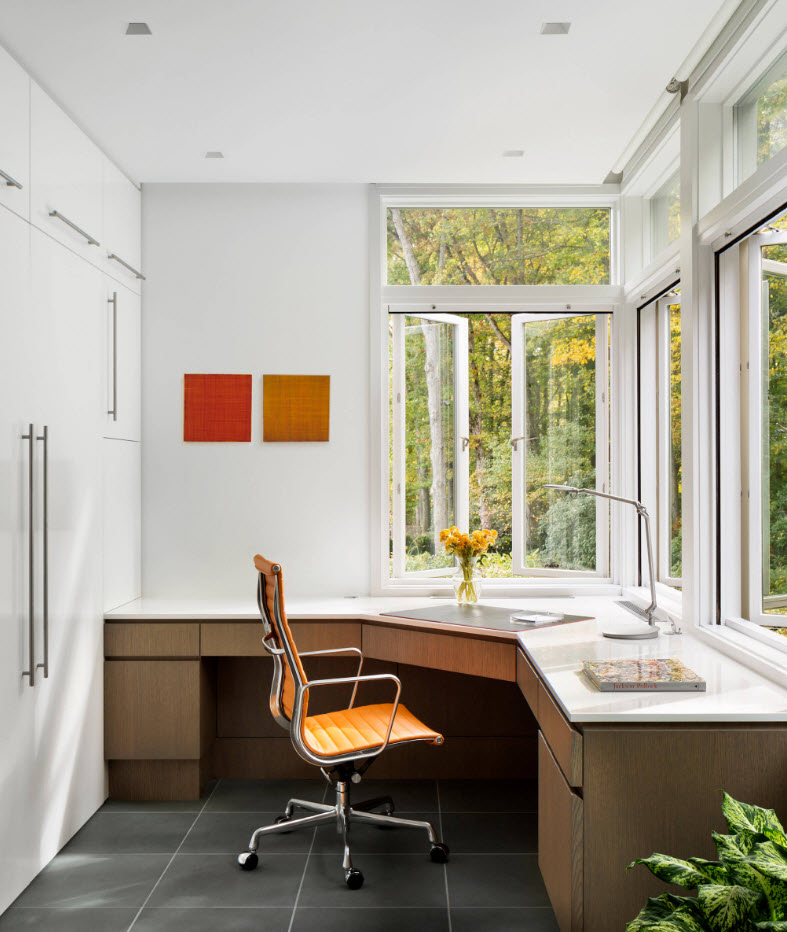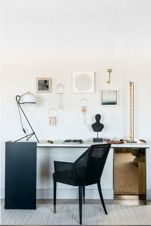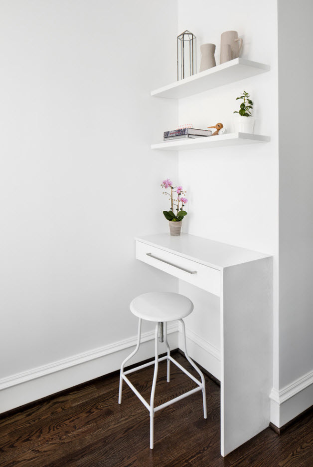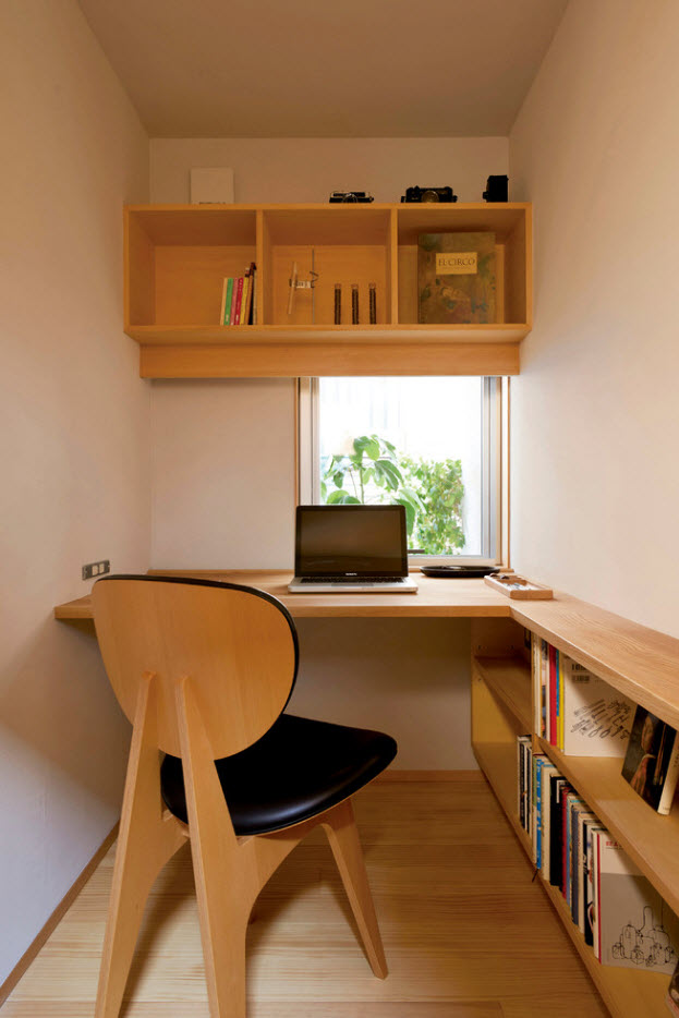 Компактность современных мебельных решений для организации рабочего места позволяет создавать мини-кабинеты буквально в любом закутке или нише квартиры или частного дома. Даже самый сложный с точки зрения геометрии участок вашего жилища может стать отличным домашним офисом, благодаря лишь встроенной или подвешенной к стене столешнице и удобному креслу. В идеале такое рабочее место должно находиться возле окна. Но не всегда удается выполнить это условие. В любом случае – настольная лампа или настенный светильник над рабочей поверхностью просто необходимы.