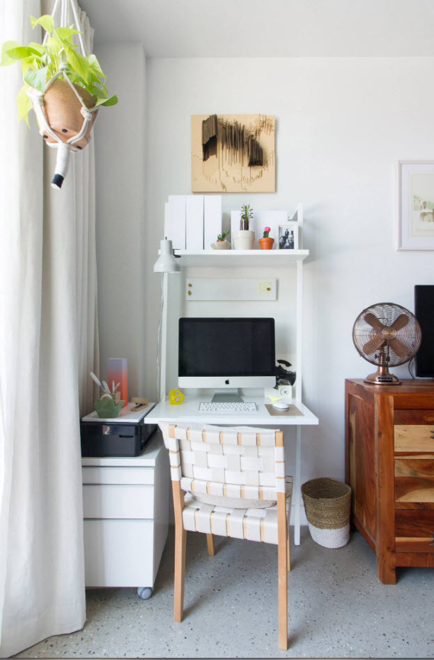 Чаще всего в современных жилищах нет возможности выделения отдельной комнаты для обустройства домашнего офиса. И хозяевам приходится решать непростую дилемму о выделении функционального сегмента в том или ином помещении квартиры или частного дома. Как правило, самой большой комнатой жилища является гостиная, именно в ней и приходится обустраивать рабочее место. Преимущество современного домашнего офиса в том, что для его организации достаточно трех досок – одну можно использовать в качестве столешнице, крепящейся к стене, из оставшихся двух модно сделать полочки.