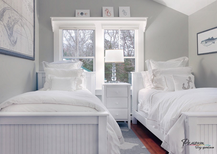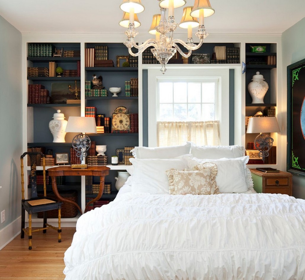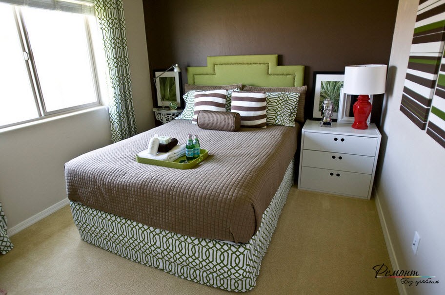 В зависимости от конструктивной особенности вашей спальни (наличие окна или его отсутствие, тип двери по открыванию, прохождение отопительной системы, площади стен и прочее), некоторые дизайнерские решения можно выполнить обыкновенным перемещением мебели или ее своеобразным размещением. Не имея возможности установить двухспальную кровать, можно использовать двухярусную. А если отодвинуть изголовье кровати от стены на полметра, можно получить пространство для размещения шкафов и всевозможных полок.