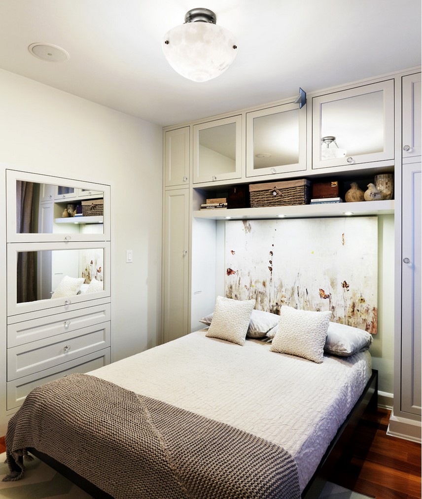 Если у вас остро стоит вопрос с размещением одежды, спальных принадлежностей (нет возможности ее хранить в другой части квартиры), его решение можно найти в конструктивных особенностях мебели. Это может быть кровать с встроенными ящиками или встроенный в стену шкаф.
