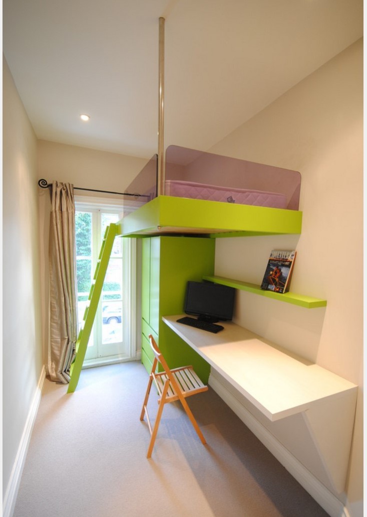 Отличным вариантом может стать подвесная мебель, например, кровать, всевозможные шкафчики. Этот вариант открывает большие возможности для воплощения самых амбициозных дизайнерских решений, в том числе – организация рабочего уголка (кабинета, если угодно).