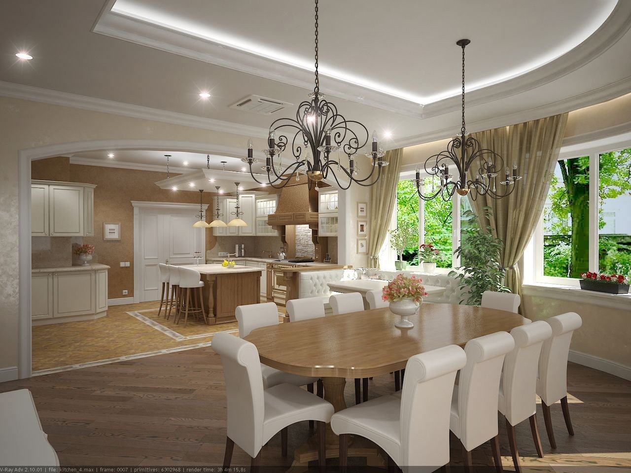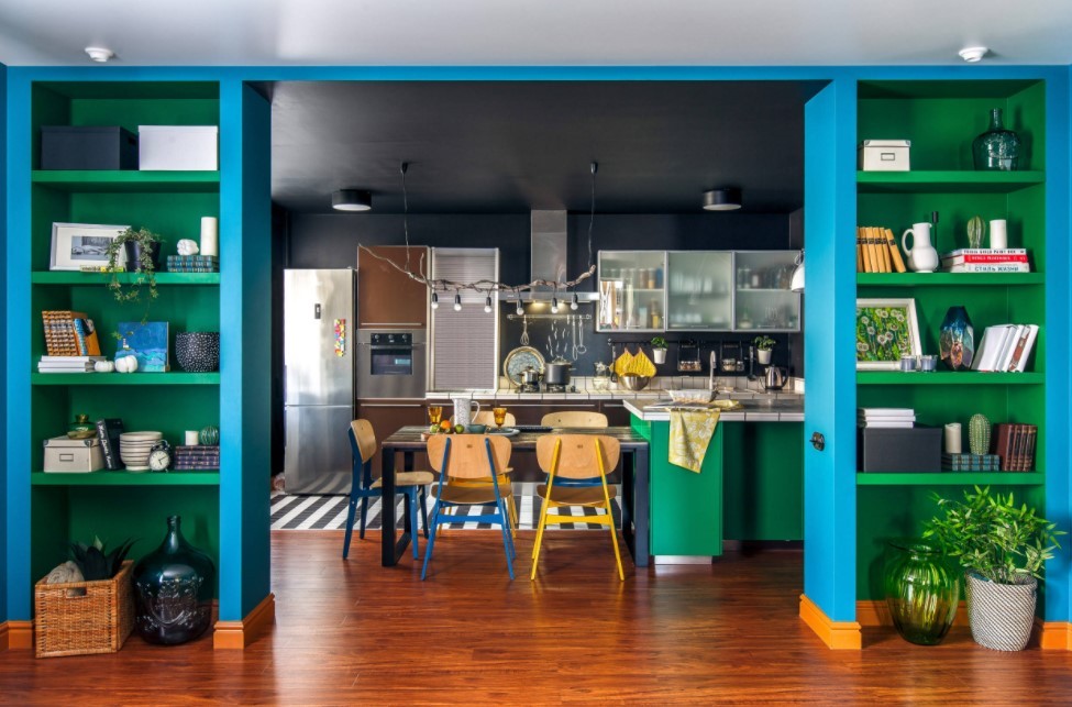 - Интерьер столовой, совмещённой с кухней