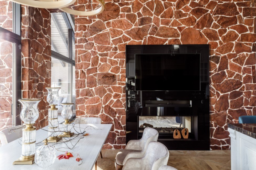Поскольку столовая относится к жилым помещениям, какие-либо табу, касающиеся выбора отделочных материалов, в этом случае отсутствуют. Подходить к вопросу обустройства с учётом некоторых ограничений нужно только в дизайне слишком маленьких столовых-кухонь, когда рабочая кухонная поверхность и область мойки находятся в непосредственной близости к обеденному столу и стульям. Здесь станут полезными керамическая плитка, обои на флизелиновой основе либо другие варианты отделочных материалов, которые способны выдержать воздействие температур, влаги и легко поддаются очистке.