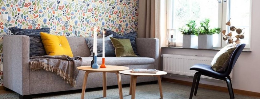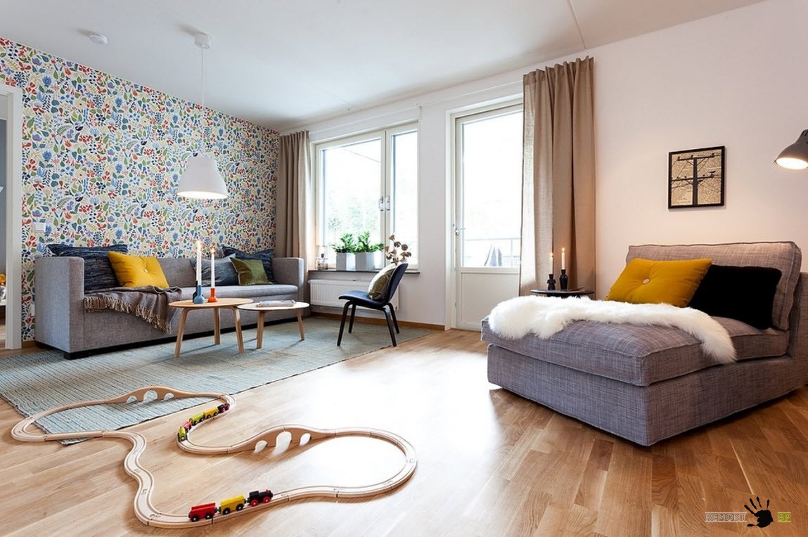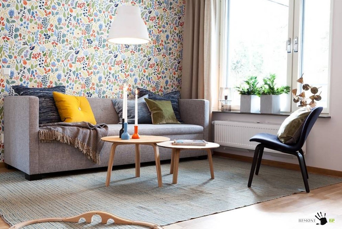 Скандинавский стиль – это свет и простор, это, как правило, холодная палитра белоснежных стен с всплесками теплоты деревянных поверхностей и ярких акцентов в текстиле или декоре. Именно по такому принципу и оформлена гостиная. Исключением из традиционного для многих оформления поверхностей помещения стало использование пестрых обоев для создания акцентной стены. Холодной скандинавской зимой так не хватает тепла природных красок, яркости цветов и травы, свежести листы и молодых побегов. Устроить свою маленькую весну можно прямо в квартире, использовав лишь немного ярких обоев.