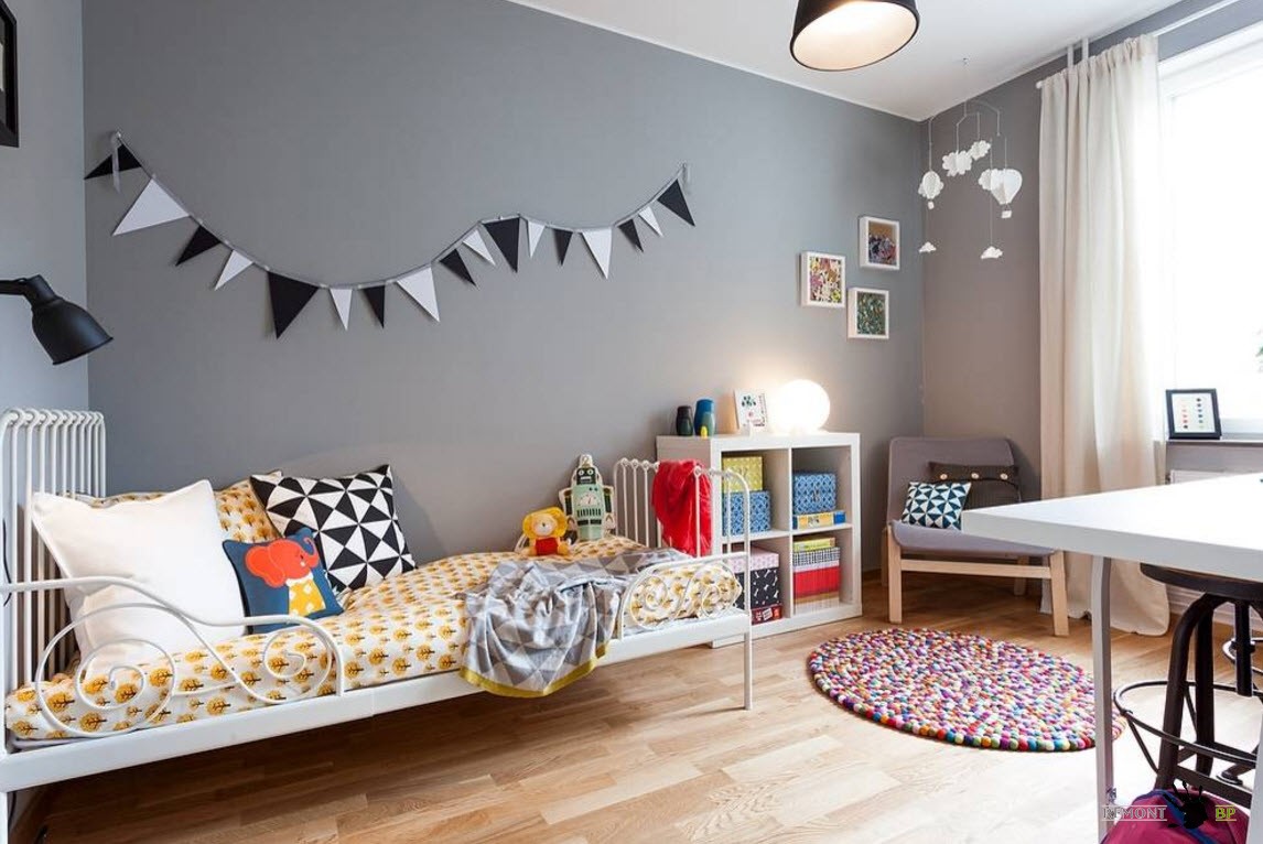 В детской комнате для отделки поверхностей использовано такое же сочетание белоснежного потолка, серых стен и ламината под дерево в качестве напольного покрытия. Только на первый взгляд может показаться, что серый цвет – неподходящий вариант для оформления помещения для ребенка. Ведь именно на фоне нейтральной расцветки особенно четко видна белоснежная мебель и яркие акценты в текстиле и декоре, ковровом покрытии и настенных декоративных элементах.