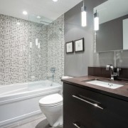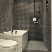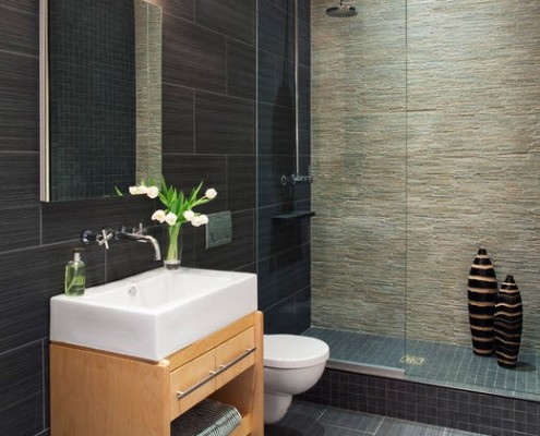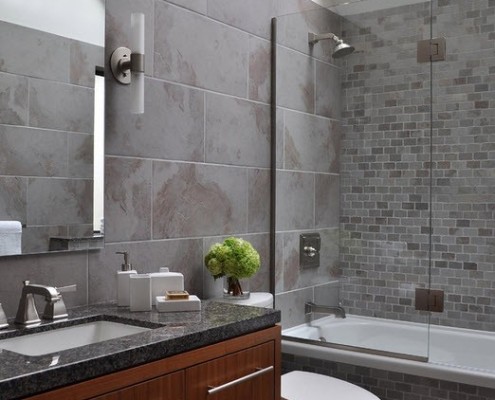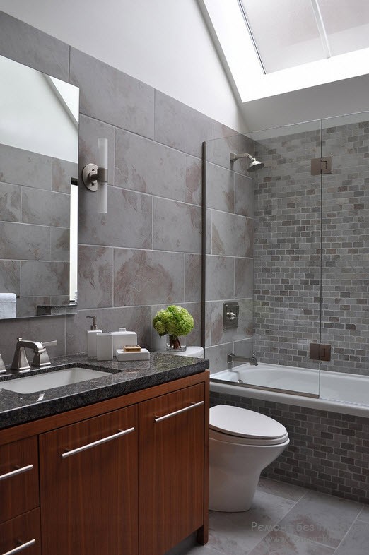 Помимо керамической плитки доверием пользуются керамогранит и мозаика, здесь речь также идет о влагоустойчивости, прочности и долговечности. В отношении мозаики многие ошибочно полагают, что маленькие размеры составных элементов полотна нежелательно применять в небольшой ванной. Но это не так. Дело в том, что за счет разнообразного контрастного включения происходит визуальное расширение границ помещения. И, так как это расширение строится на игре контрастов, то независимо от того, какой вы выбрали цвет комнаты, мозаика должна иметь близкий (но не такой же) по тону цвет.