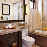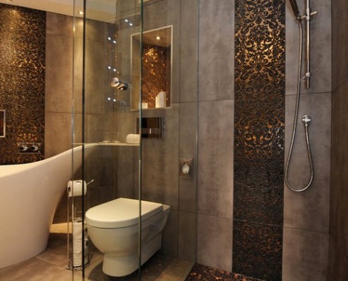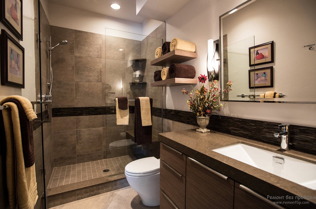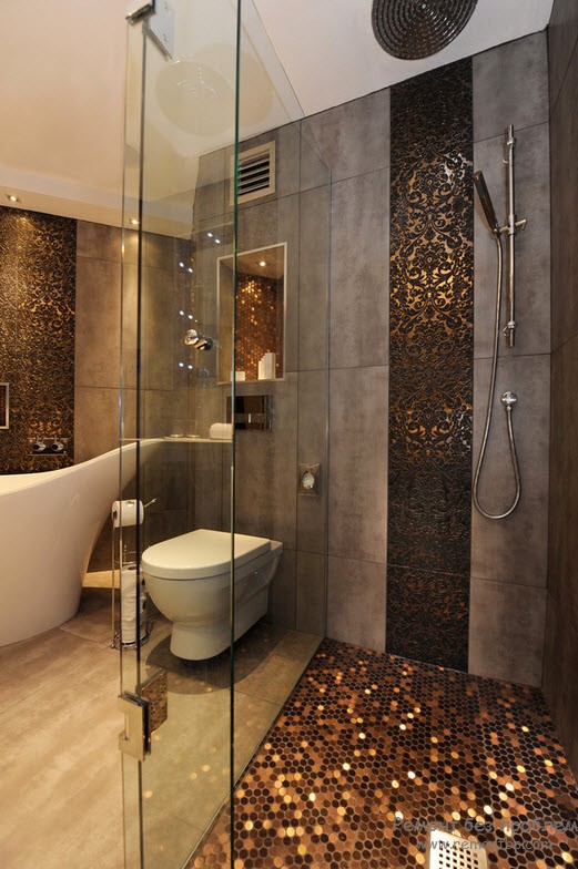 Выбирая коричневый цвет для дизайна данной комнаты, идет расчет на роскошь, но ненавязчивую, а изящную. Вдобавок к этому коричневый цвет обладает прекрасными релаксационными свойствами. В такой ванной будет приятно понежиться после тяжелого трудового дня. Чтобы подчеркнуть грацию коричневого дизайна, используйте декор или покрытие кранов в бронзовых, медных или золотых цветах. Если взять шоколадный оттенок, то помимо роскоши здесь будет царить тепло. Усилить теплую ауру поможет союз с деревом, а расслабить – с белым.