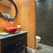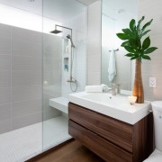 Также наиболее частое оформление – это дерево. Его можно назвать классикой. Его природное происхождение наполняет помещение особой аурой, прекрасным ароматом и великолепным внешним видом. Цвет натурального дерева подходит практически под любой стиль, любые аксессуары и декор. Но с деревом нужно быть осторожным, особенно когда оно находится в местах с повышенной влажностью. Приобретая деревянную мебель для ванной или другие изделия из дерева, убедитесь, что они обработаны специальными веществами, защищающими от влаги и перепада температур.