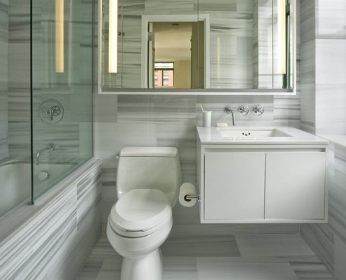В отношении ванной мебели можно воспользоваться следующим советом: если ванна расположена вдоль одной стены, то умывальную раковину и зеркало поместите у противоположной стены, а унитаз лучше разместить напротив входной двери. Это сэкономит значительное количество пространства.