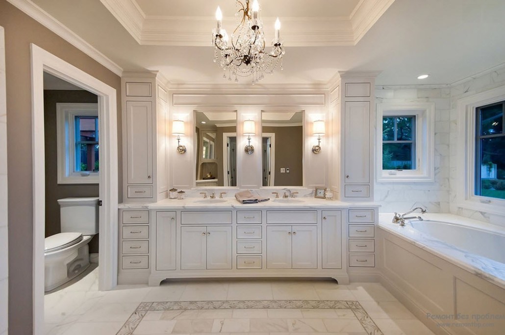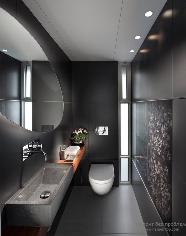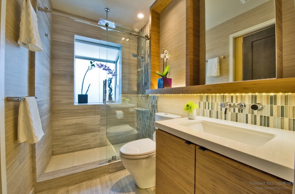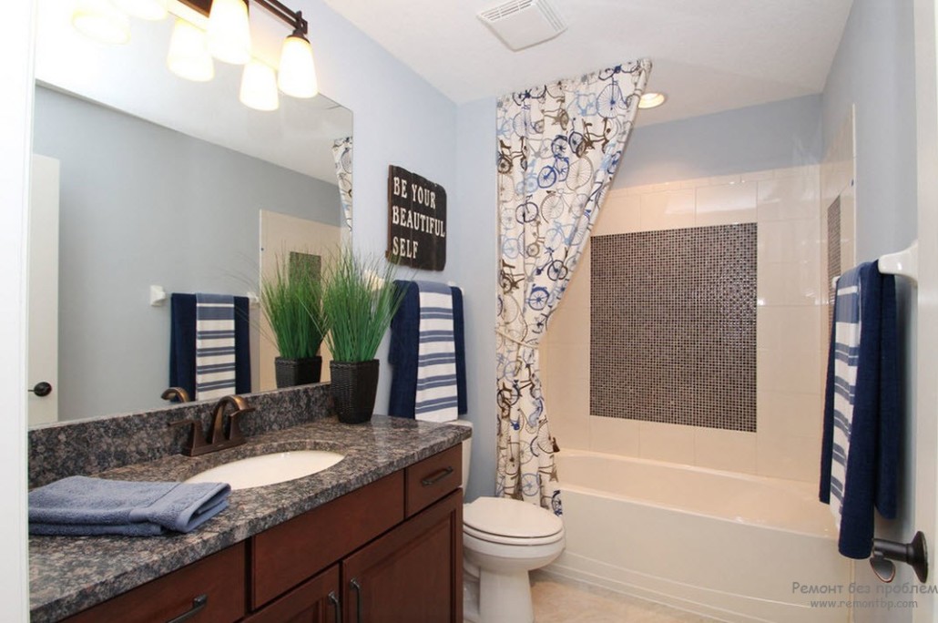 Так как ванна, совмещенная с туалетом, редко обладает внушительными размерами, то скорректировать этот недостаток можно с помощью хорошего освещения. Очень часто прибегают к световому зонированию, а именно: над раковиной и зеркалом используют направленный свет, а над ванной более уместен мягкий и рассеянный свет.