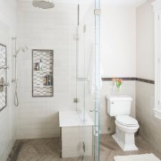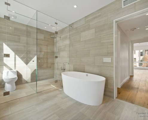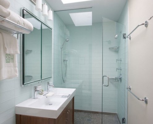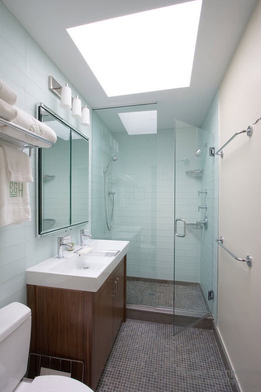 Кстати, с помощью керамической плитки, которая за долгие годы ее использования доказала свою практичность и долговечность, можно зрительно увеличить размер комнаты, а, точнее, удлинить потолок, для этого используется рисунок с вертикальной формой. Остальные предметы интерьера следует подбирать с учетом этого рисунка, может даже использовать его в небольшом количестве на других поверхностях, а также в аналогичной цветовой гамме. Это делается для того, чтобы не терялось визуализированное расширение. Для завершения воздушной атмосферы можно использовать модную в последнее время стеклянную раковину.