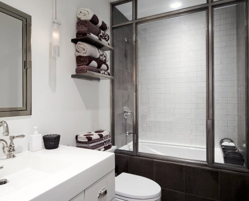 Водосточные механизмы, расположенные за унитазом, также могут быть скрыты специальным коробом. А сверху этого самого короба можно разместить необходимые ванные принадлежности: полотенца, тюбики, шампуни, крема и так далее. Даже подоконник многим служит вместо полочки, его даже можно специально сделать широким, чтобы помещалось больше предметов.