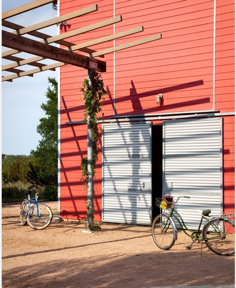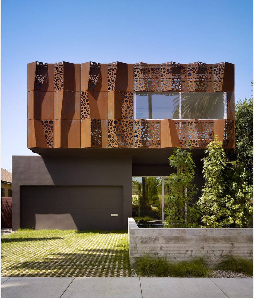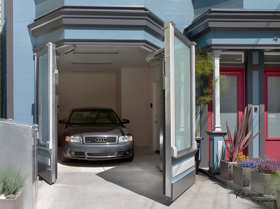 Обычно распашные ворота не имеют механизма их автоматического открывания. Однако творческая мысль человека не знает границ. Довольно оригинальное конструкторское решение ворот позволило автоматизировать их открывание. Одновременно с этим поражает скрытность самого гаража, благодаря этому решению. Согласитесь, что в закрытом положении ворот невозможно даже предположить, что за этой выступающей частью дома находится гараж.