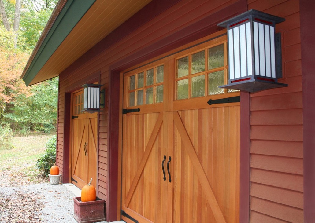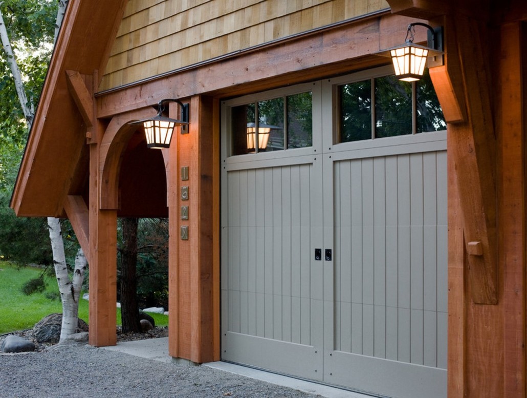 - Дерево. Ворота «предков» современных гаражей не отличались оригинальностью используемого материала. Конечно же, это были ворота из крепких пород древесины. Но этот материал не потерял актуальность и сегодня. Особенно популярны деревянные ворота с коваными навесными петлями и старинной фурнитурой. Все это помогает им прекрасно вписываться в современный дизайн дома с гаражом, особенно если акцент делается на ретро-стиль.