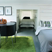 Согласно действующей традиции спальня взрослых располагается на первом этаже здания. Помимо гаража с доступом в мастерскую, нижний этаж нередко вмещает площадку для тренажеров и спортивного инвентаря. Выше расположены комнаты для младших членов семьи и санузлы.