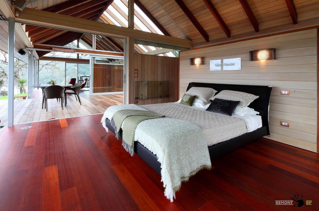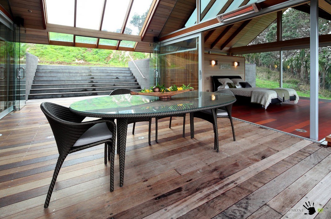 С крытой террасы открывается вид в спальню. Стекло дает возможность ощутить бескрайность пространства и свободу.