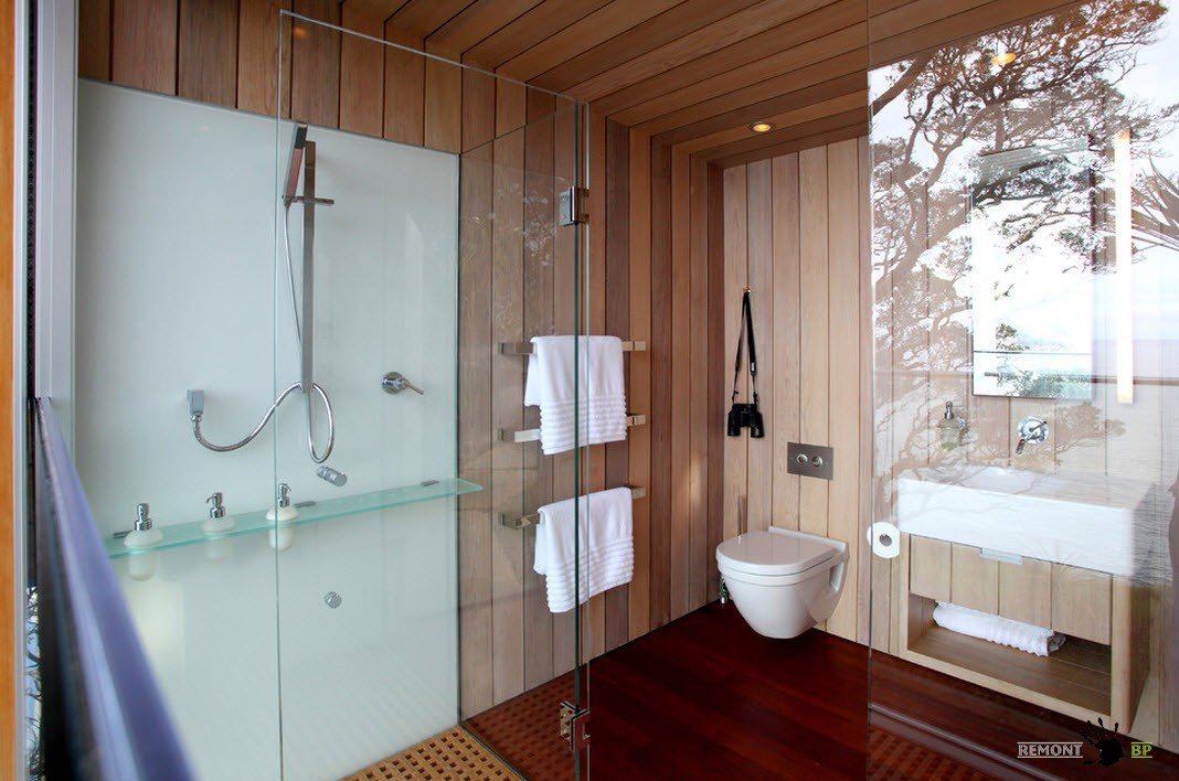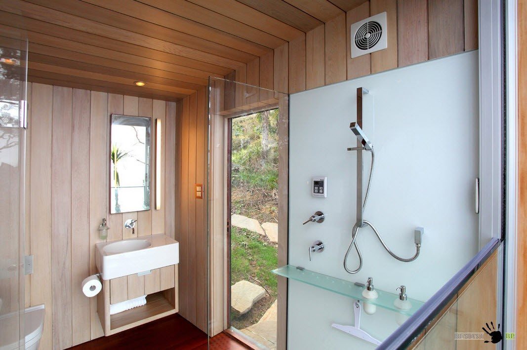Внутри санузел оформлен светлой доской. Небольшое помещение оборудовано максимальным количеством необходимого оборудования для поддержания личной гигиены.