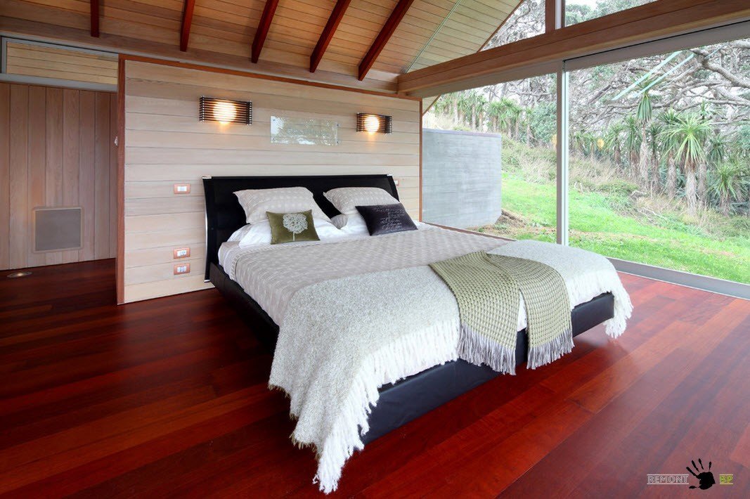 Ламинат цвета венге придает комнате изысканности. На фоне необработанной доски на стенах глянцевый пол смотрится очень оригинально. В этой комнате также стоит обратить внимание на неприкрытые балки крыши в стиле охотничьего домика.