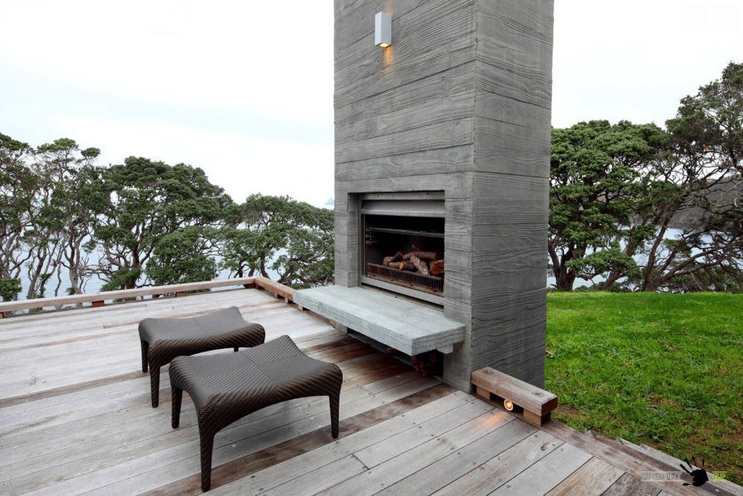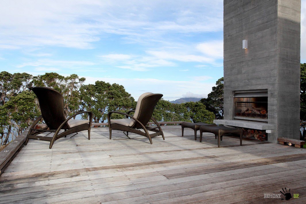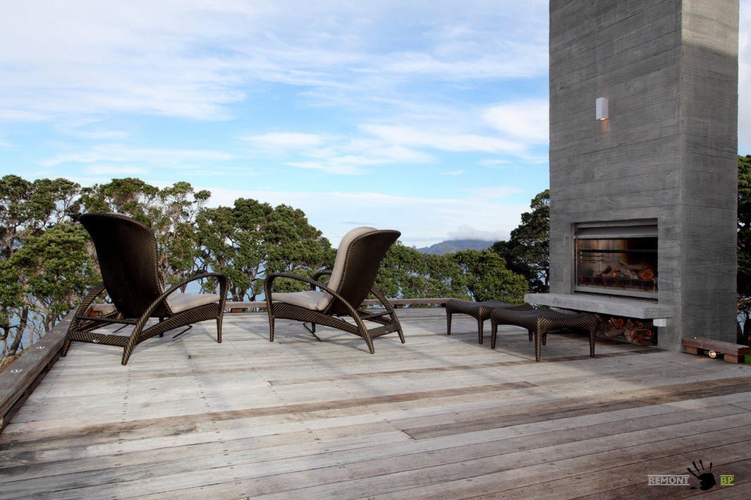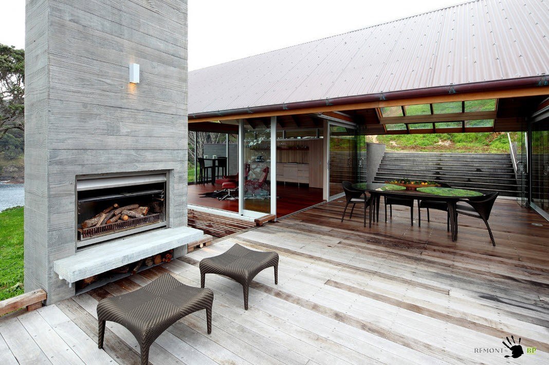 Прекрасный вид, открывающийся с террасы, дополняется предметами декора, которые обладают еще и функциональной нагрузкой. Большой камин, оформленный грубыми деревянными досками, придает террасе особый шарм. По вечерам свет от такого камина создаст неповторимый уют.