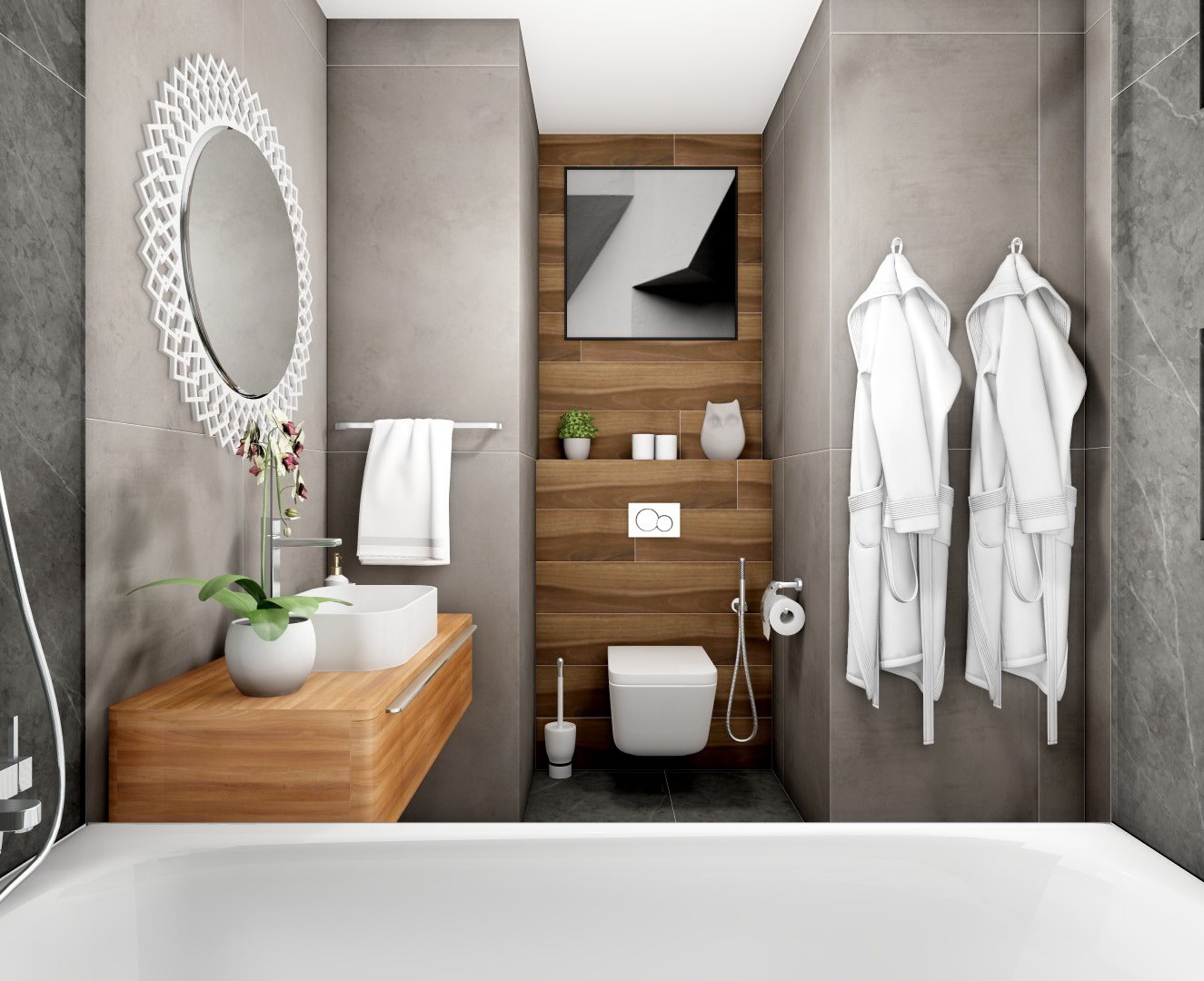 - Отделочные материалы: используйте матовую или текстурированную плитку под дерево, цвета в природных мотивах (песок, солома, земля, кофейные зёрна).
