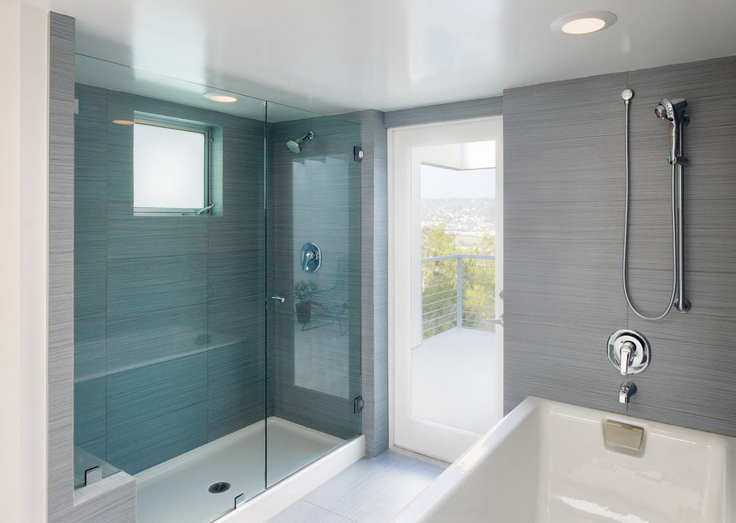 - Застеклённые душевые кабины с прозрачными дверцами выглядят легко и воздушно.