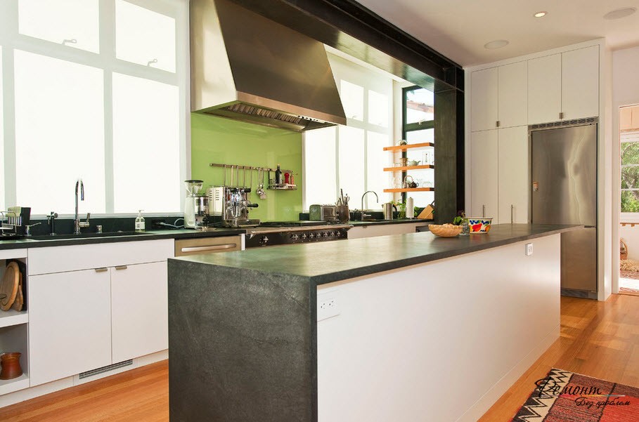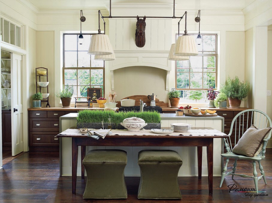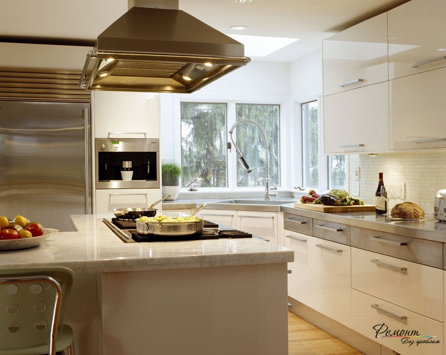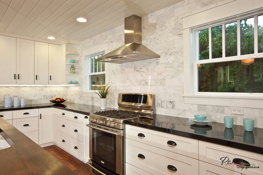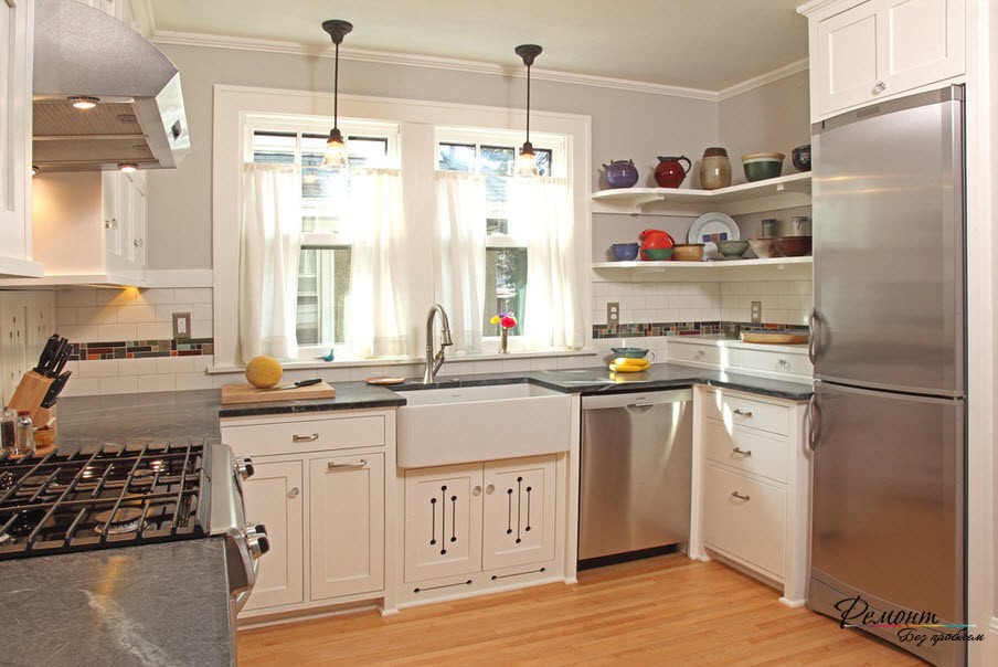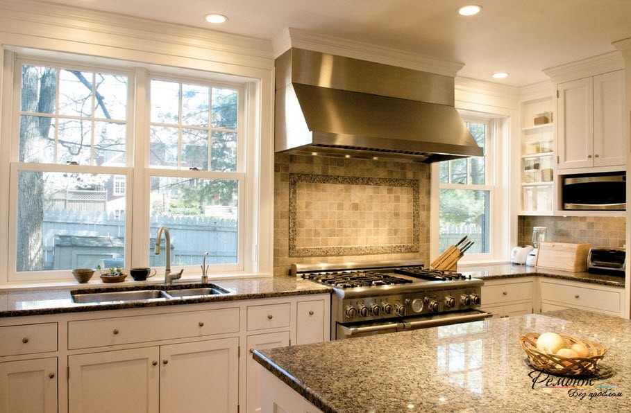 Избежать лишней работы можно, заранее предусмотрев на кухне два окна. В таком помещении света и воздуха будет в два раза больше, чем в случае использования лишь одного проема.