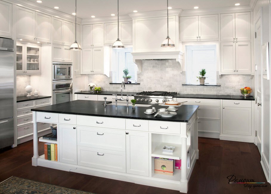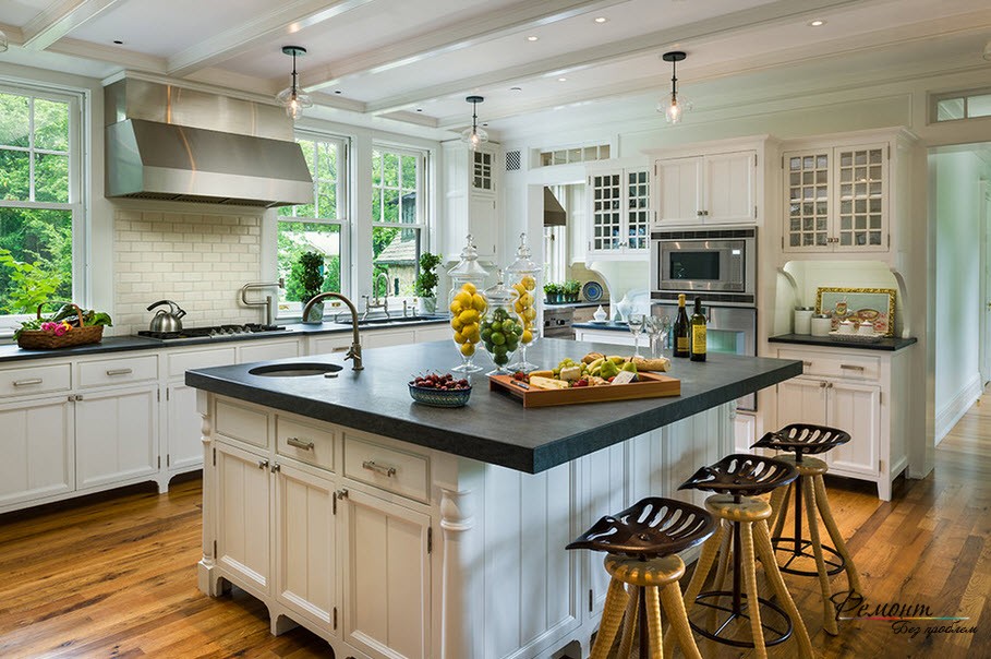 Часто кухня с двумя окнами – это угловое помещение. Оформляя такое пространство грамотно, можно добиться потрясающих результатов. Кухня будет просторной и светлой, а также в нее поместятся все необходимые предметы обстановки. Чаще всего такие нестандартные кухни имеют большой метраж, что является немаловажным фактором для тех, кто много времени проводит возле плиты.