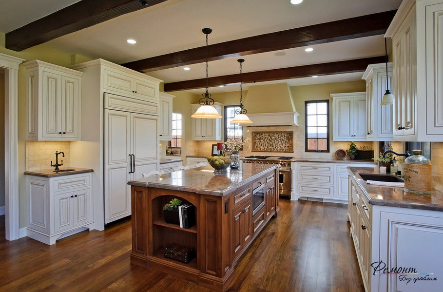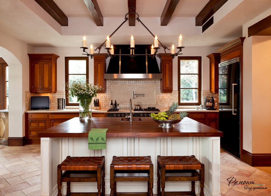 Кроме того, мебель вдоль окон позволяет надежно укрыть батареи, которые своим видом могут испортить общую картину. Цветовые решения для хорошо освещенной кухни могут быть любыми. Даже темные оттенки на стенах такой кухни не сделают его мрачным, а лишь придадут особую уникальность оформлению.