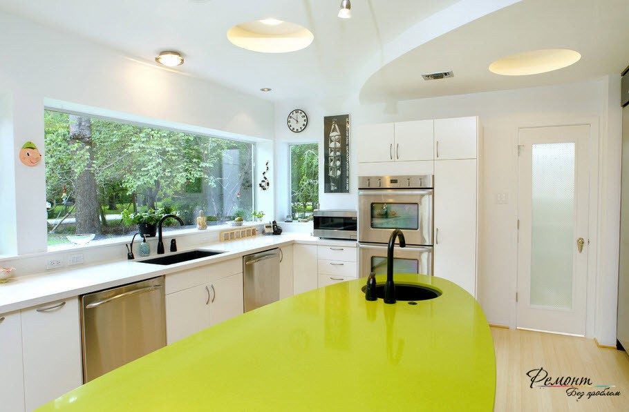 В современном строительстве часто кухне не придается должного значения. Это отражается на размере и форме помещения. Удлиненная комната, напоминающая вагончик, страдает от недостатка света и пространства. Выходом могут стать два окна на противоположных стенах и кухонная мебель, расположенная вдоль стен с окнами. В данном случае уместен дизайнерский ход по соединению рабочей поверхности с подоконником. Этим удастся сэкономить пространство помещения и не ограничивать в движениях того, кто будет пользоваться этой поверхностью.