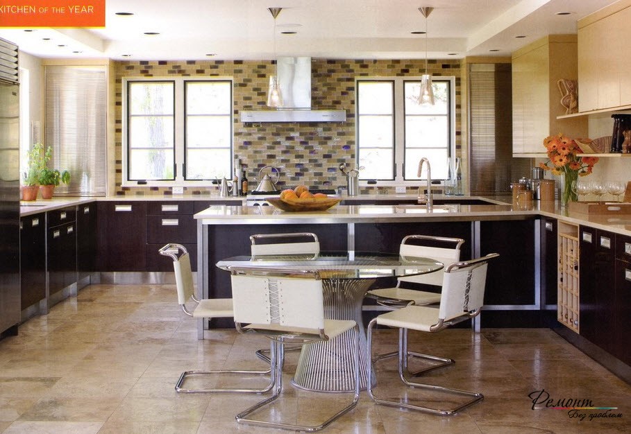Если площадь кухни позволяет зонирование, то столовую часть лучше разместить возле окна. Это создаст необходимую комфортную обстановку, располагающую к приему пищи и приятной беседе. Если окна в такой кухне панорамный, то помещение обретает особенный шарм и имеет уже не только практическое значение, но и является местом с особенным настроением. При грамотном использовании преимуществ кухни с двумя окнами это место может стать любимым для каждого члена семьи.