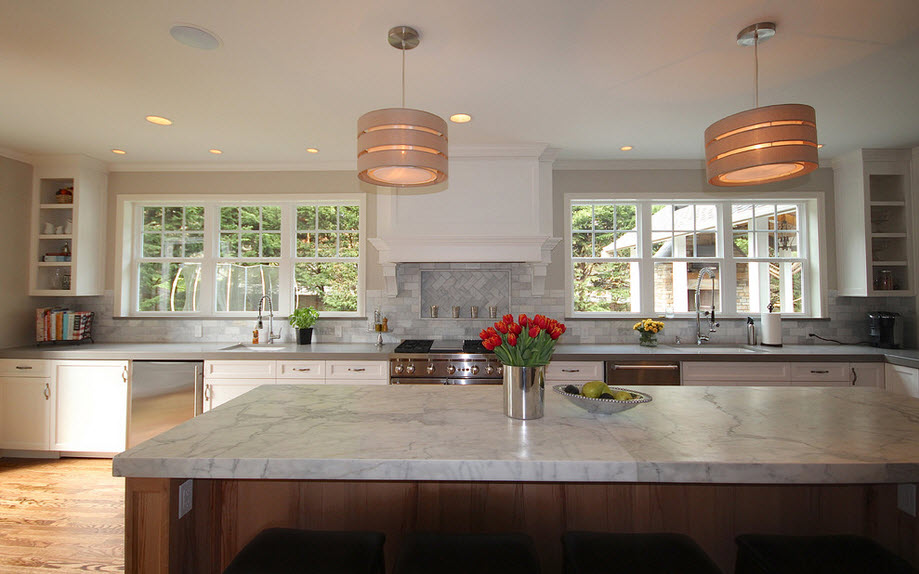 Чтобы сгладить неровности, связанные с низким положением линии окон, можно использовать натуральный камень. Этот материал просто и красиво оформит переход между столешницей и подоконником.