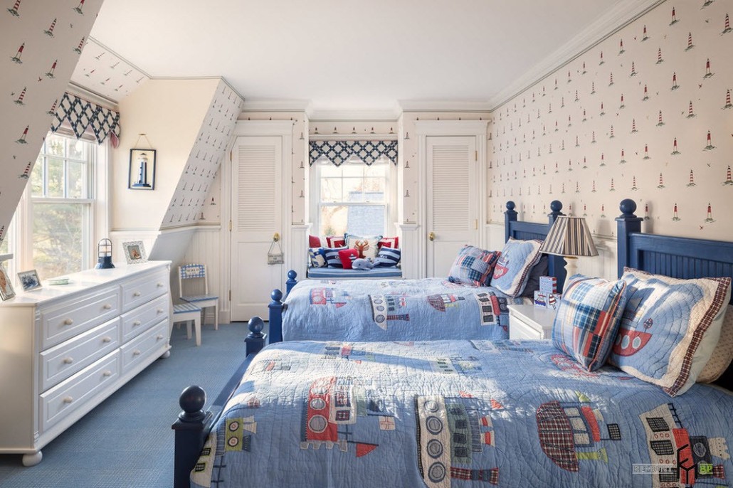 2. Правильно подобранные обои в комнате, где планируется разместить два спальных места, помогут зрительно сделать потолок выше. Рекомендуются покрытия с мелким рисунком или в вертикальную полоску. Этот прием позволит избежать ощущения перегруженности пространства. Следует учитывать, что цвет обоев тоже влияет на визуальное восприятие: благодаря светлым оттенкам комната станет более просторной и холодной, темные тона зрительно сократят размеры комнаты и сделают ее более теплой.