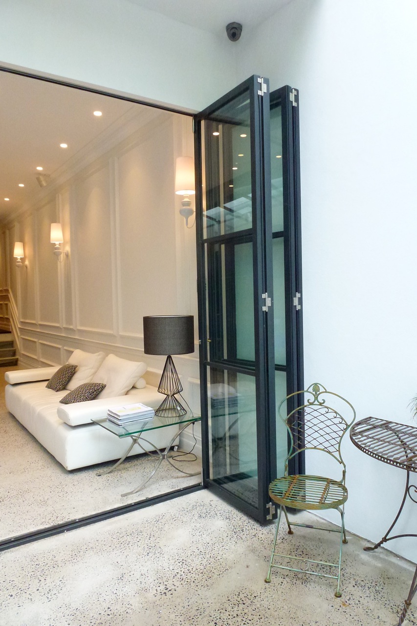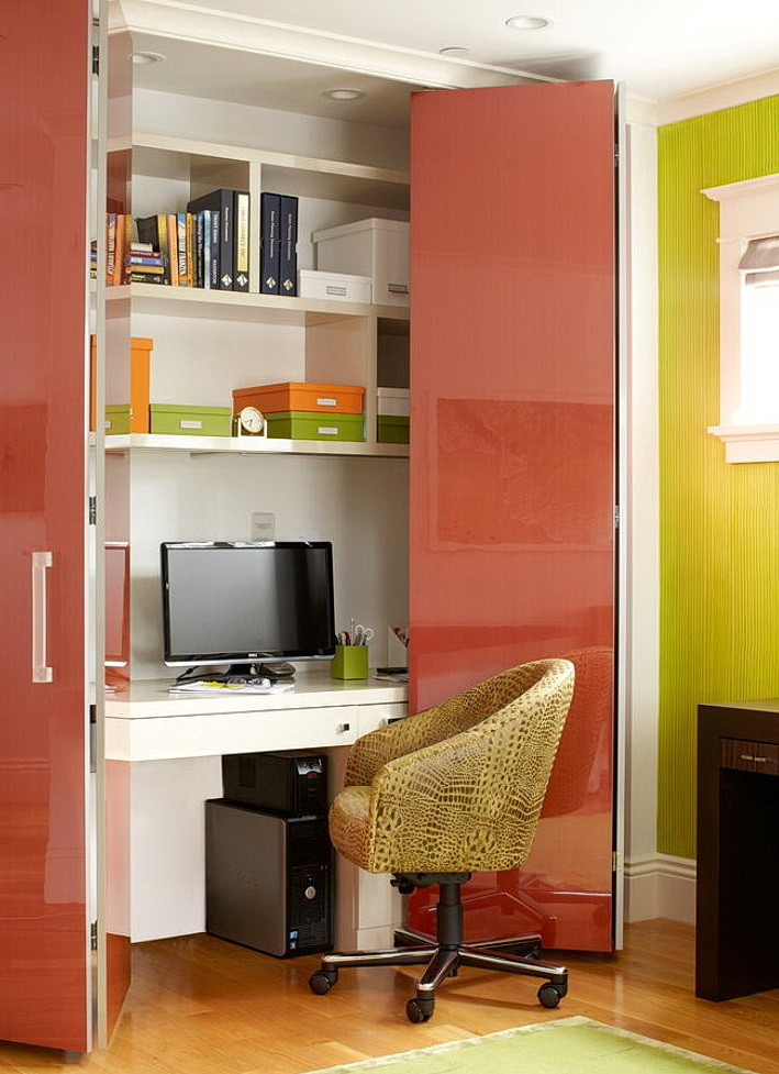 Такие модели отлично подойдут для кладовой, где хранятся зимние консервы, или в гардеробную, которая не всегда выглядит идеально. Из-за того, что складная дверь не обеспечивает идеального акустического комфорта и уединения, они редко используются для интимных интерьеров, таких как спальни, ванная комната или туалет. Однако они сочетают в себе преимущества навесных и раздвижных дверей и дают много других возможностей для организации даже самого маленького интерьера.