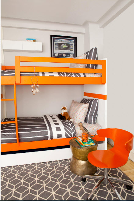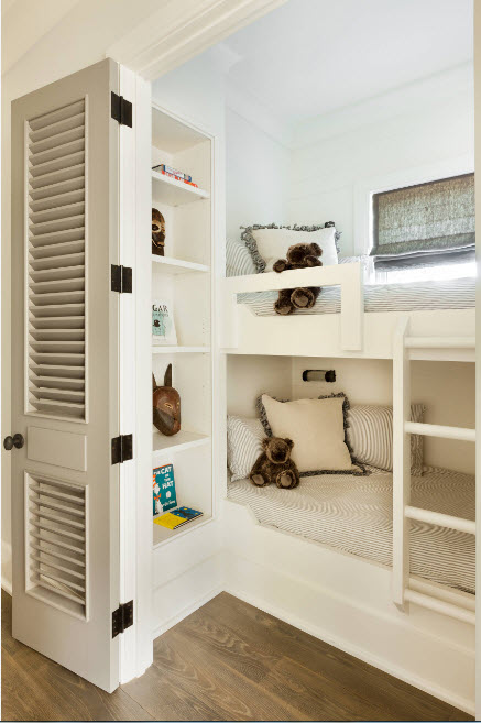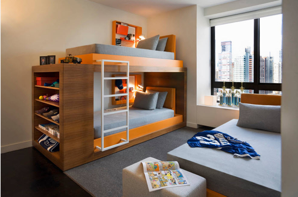В аналогичных целях можно использовать откидную двухъярусную кровать. Днем комната может служить гостиной или игровой (кровать «прячется» в шкафу), а ночью становится спальней.